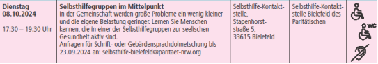 Brauchen Sie Unterstützung? Anfragen für Schrift- oder Gebärdensprachdolmetschung bitte bis zum 13.09.2026 an: selbsthilfe-bielefeld@paritaet-nrw.org